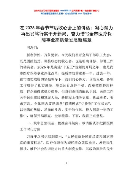 / 在2026年春节节后收心会上的讲话:凝心聚力再出发笃行实干开新局,奋力谱写全市医疗保障事业高质量发展新篇章