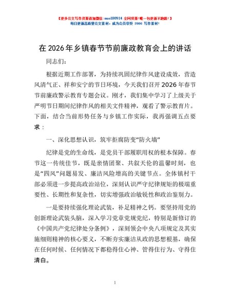 / 在2026年乡镇春节节前廉政教育会上的讲话