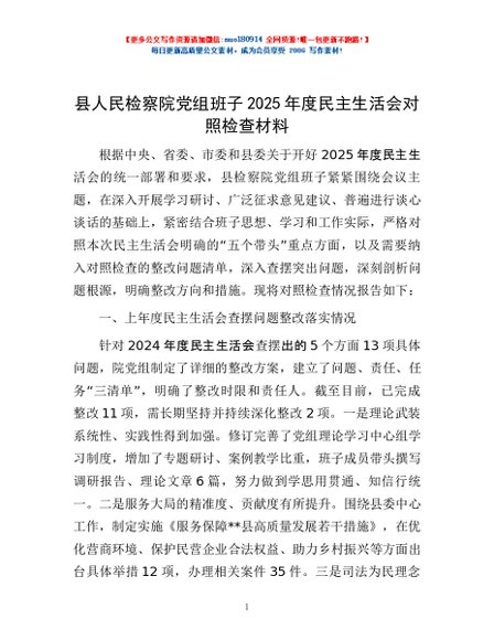 / 县人民检察院党组班子2025年度民主生活会对照检查材料