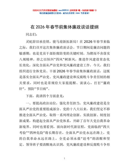 / 在2026年春节前集体廉政谈话提纲