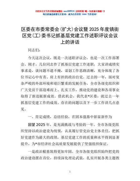 / 区委在市委常委会(扩大)会议暨2025年度镇街区党(工)委书记抓基层党建工作述职评议会议上的讲话