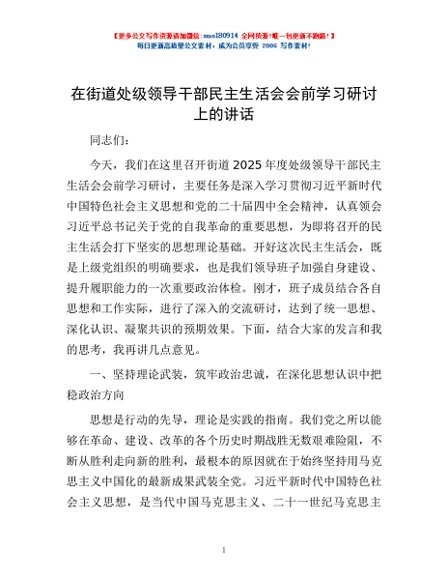 / 在街道处级领导干部民主生活会会前学习研讨上的讲话