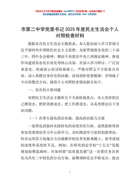 / 市第二中学党委书记2025年度民主生活会个人对照检查材料