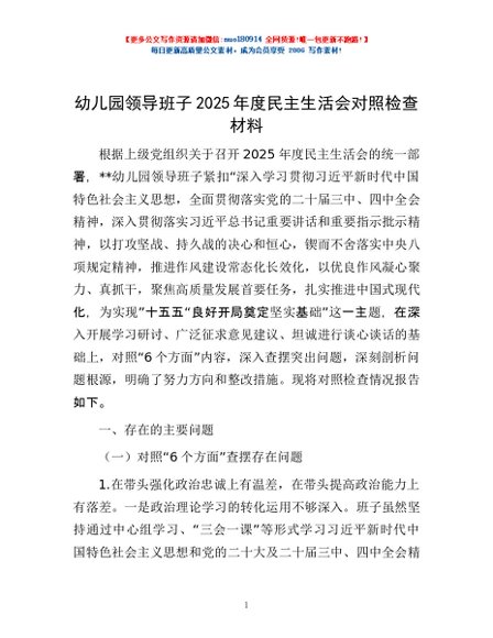 / 幼儿园领导班子2025年度民主生活会对照检查材料