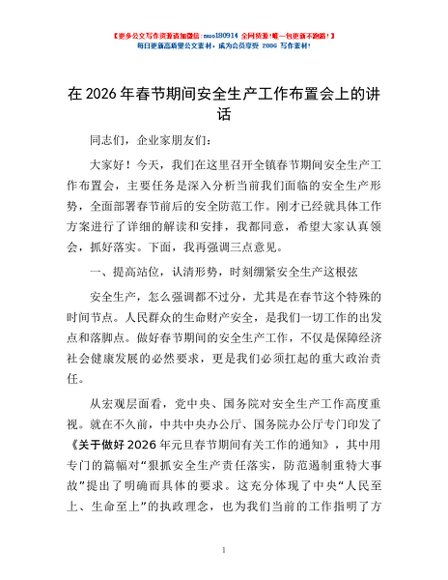/ 在2026年春节期间安全生产工作布置会上的讲话