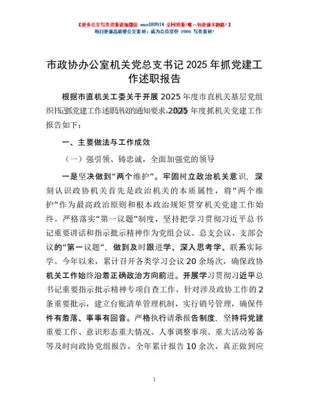 / 市政协办公室机关党总支书记 2025年抓党建工作述职报告