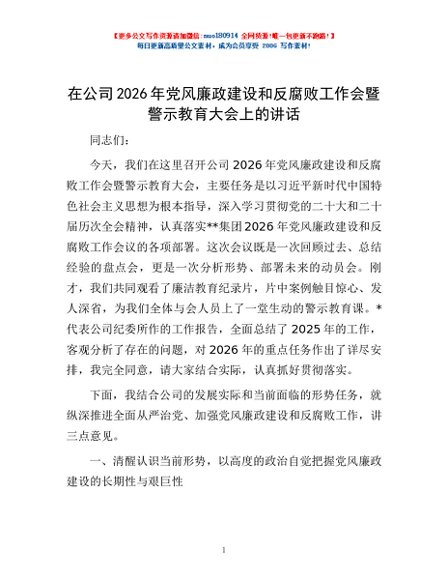 / 在公司2026年党风廉政建设和反腐败工作会暨警示教育大会上的讲话