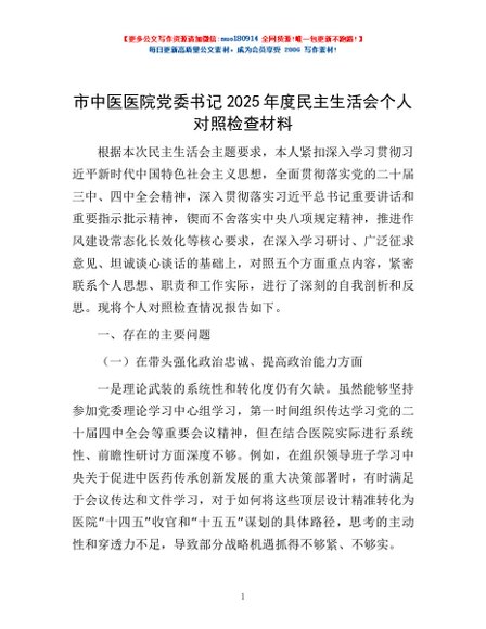 / 市中医医院党委书记2025年度民主生活会个人对照检查材料