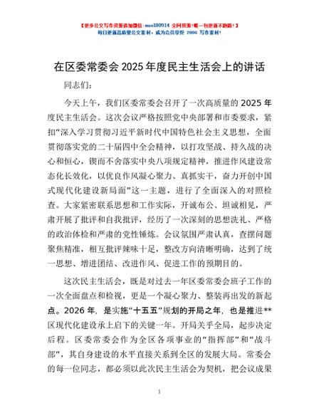 / 在区委常委会2025年度民主生活会上的讲话