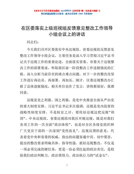 / 在区委落实上级巡视组反馈意见整改工作领导小组会议上的讲话