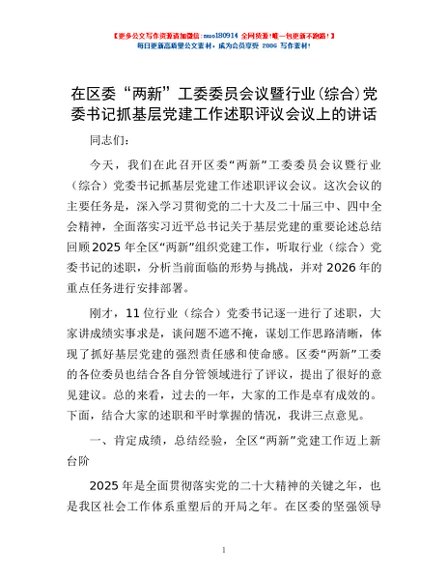 / 在区委“两新”工委委员会议暨行业(综合)党委书记抓基层党建工作述职评议会议上的讲话