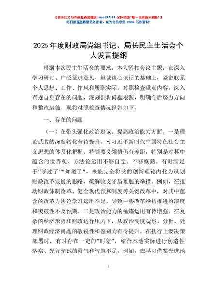 / 2025年度财政局党组书记、局长民主生活会个人发言提纲