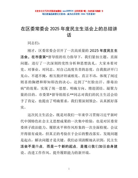 / 在区委常委会2025年度民主生活会上的总结讲话