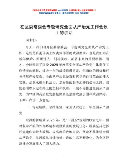 / 在区委常委会专题研究全面从严治党工作会议上的讲话