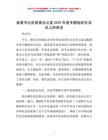 / 县委书记在县委办公室2025年度专题组织生活会上的讲话