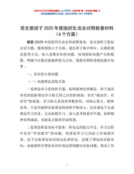 / 党支部班子2025年度组织生活会对照检查材料(6个方面)