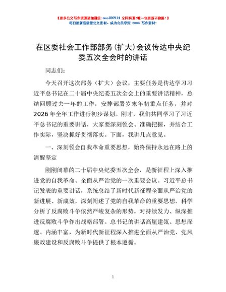 / 在区委社会工作部部务(扩大)会议传达中央纪委五次全会时的讲话