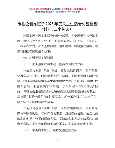 / 市县级领导班子2025年度民主生活会对照检查材料(五个带头)