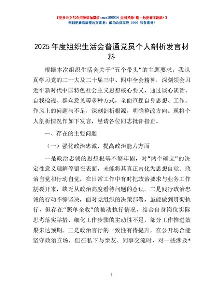 / 2025年度组织生活会普通党员个人剖析发言材料