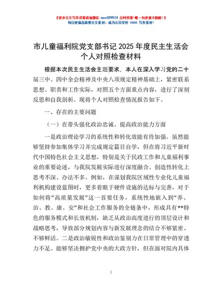 / 市儿童福利院党支部书记2025年度民主生活会个人对照检查材料