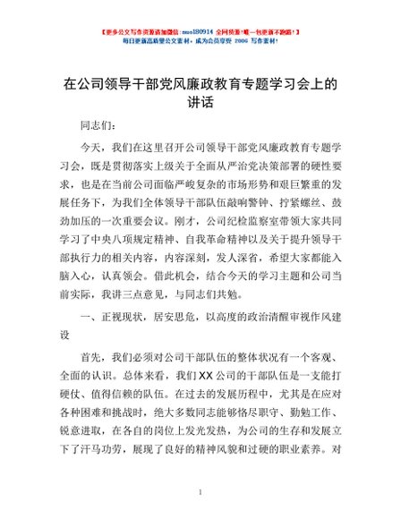 / 在公司领导干部党风廉政教育专题学习会上的讲话