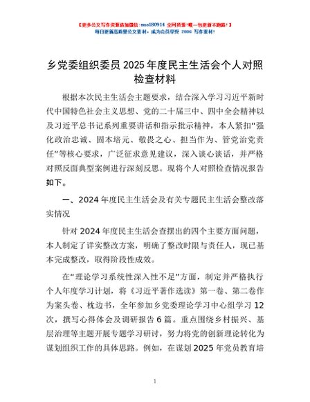 / 乡党委组织委员2025年度民主生活会个人对照检查材料