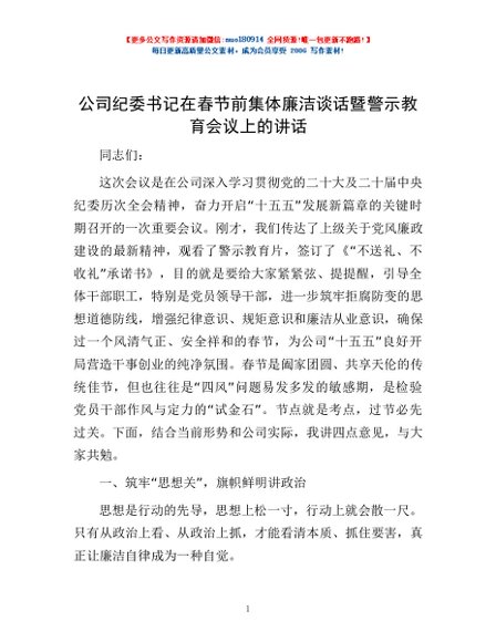 / 公司纪委书记在春节前集体廉洁谈话暨警示教育会议上的讲话
