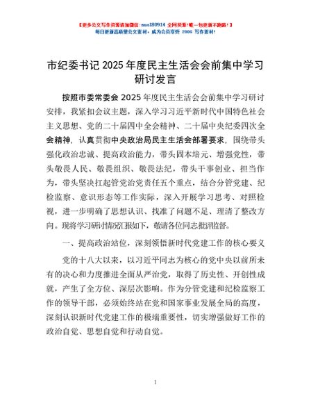 / 市纪委书记2025年度民主生活会会前集中学习研讨发言