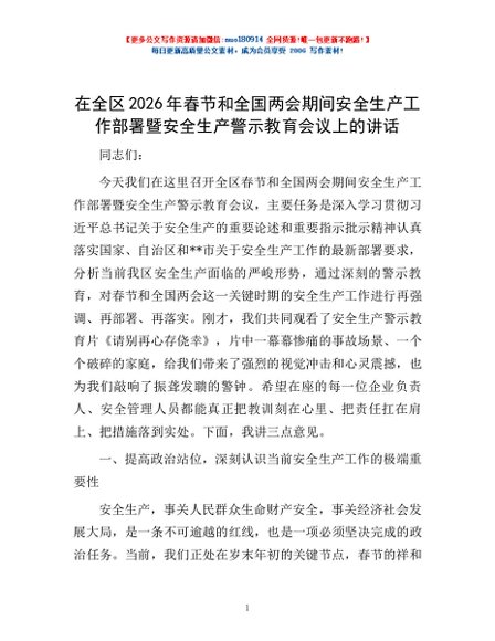 / 在全区2026年春节和全国两会期间安全生产工作部署暨安全生产警示教育会议上的讲话