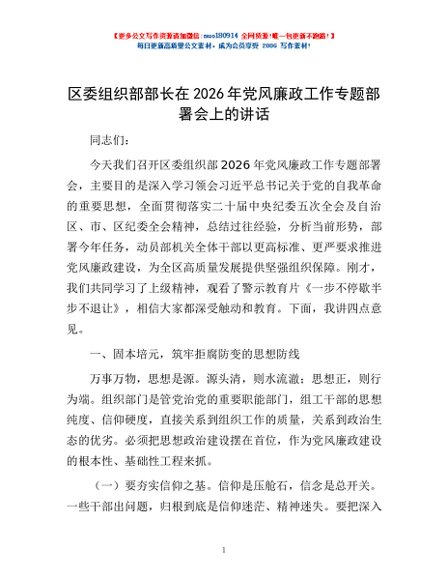 / 区委组织部部长在2026年党风廉政工作专题部署会上的讲话