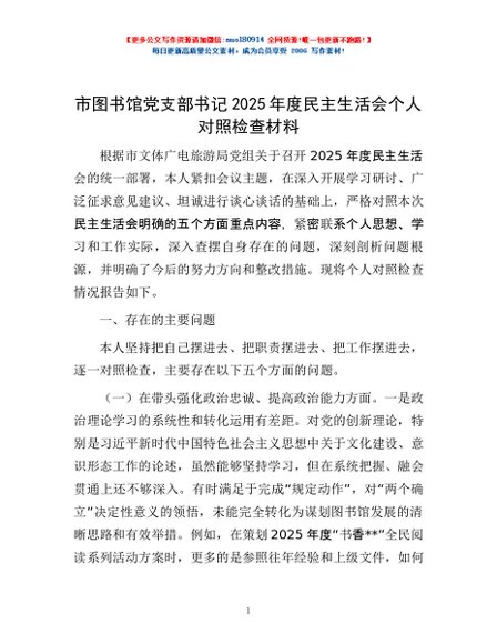 / 市图书馆党支部书记2025年度民主生活会个人对照检查材料