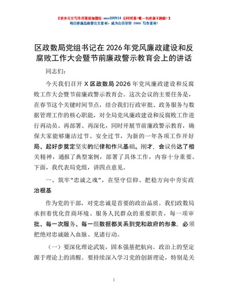 / 区政数局党组书记在2026年党风廉政建设和反腐败工作大会暨节前廉政警示教育会上的讲话