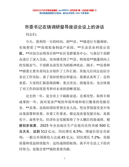 / 市委书记在镇调研督导座谈会议上的讲话