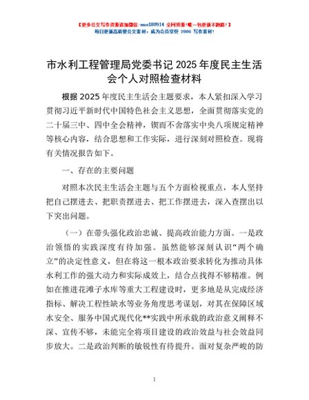 / 市水利工程管理局党委书记2025年度民主生活会个人对照检查材料