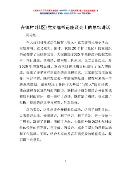 / 在镇村(社区)党支部书记座谈会上的总结讲话