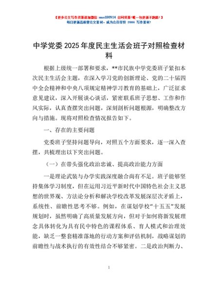 / 中学党委2025年度民主生活会班子对照检查材料