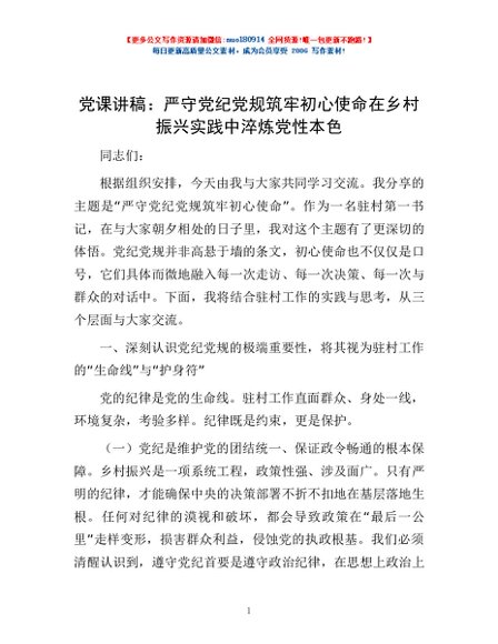 / 党课讲稿:严守党纪党规筑牢初心使命 在乡村振兴实践中淬炼党性本色