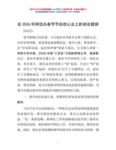 / 在2026年网信办春节节后收心会上的讲话提纲