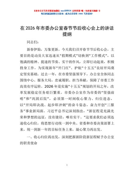 / 在2026年市委办公室春节节后收心会上的讲话提纲