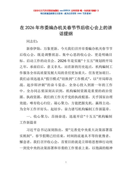 / 在2026年市委编办机关春节节后收心会上的讲话提纲