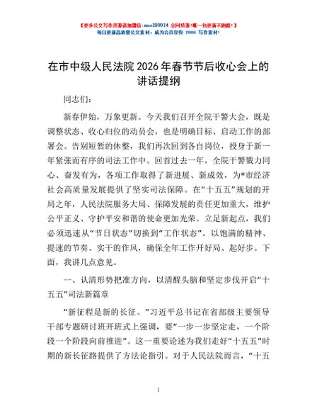 / 在市中级人民法院2026年春节节后收心会上的讲话提纲