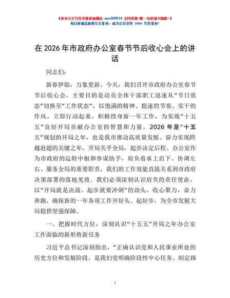 / 在2026年市政府办公室春节节后收心会上的讲话