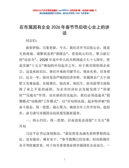 / 在市属国有企业2026年春节节后收心会上的讲话