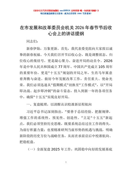 / 在市发展和改革委员会机关2026年春节节后收心会上的讲话提纲