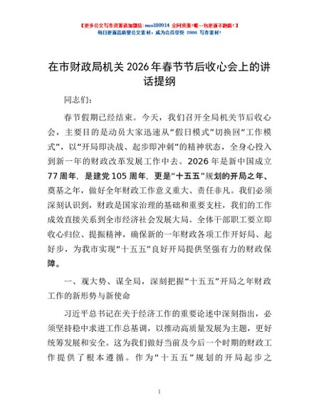 / 在市财政局机关2026年春节节后收心会上的讲话提纲