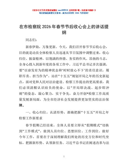 / 在市检察院2026年春节节后收心会上的讲话提纲