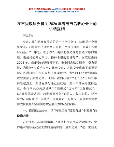 / 在市委政法委机关2026年春节节后收心会上的讲话提纲
