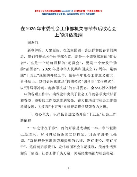 / 在2026年市委社会工作部机关春节节后收心会上的讲话提纲