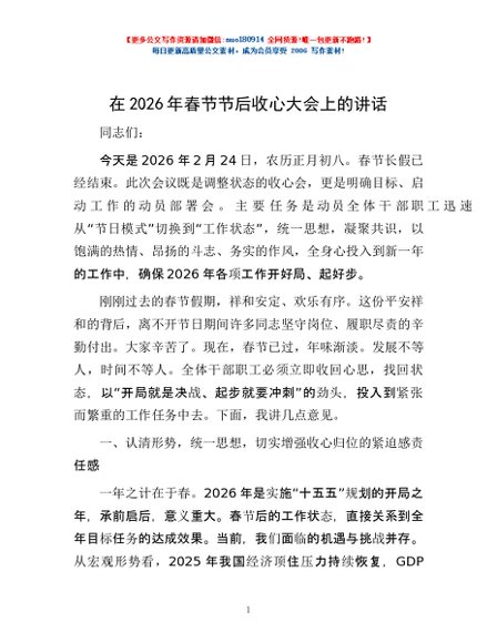 / 在2026年春节节后收心大会上的讲话