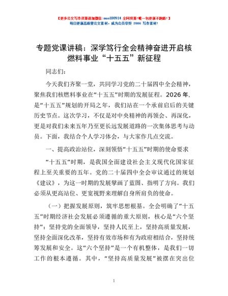 / 专题党课讲稿:深学笃行全会精神 奋进开启核燃料事业“十五五”新征程